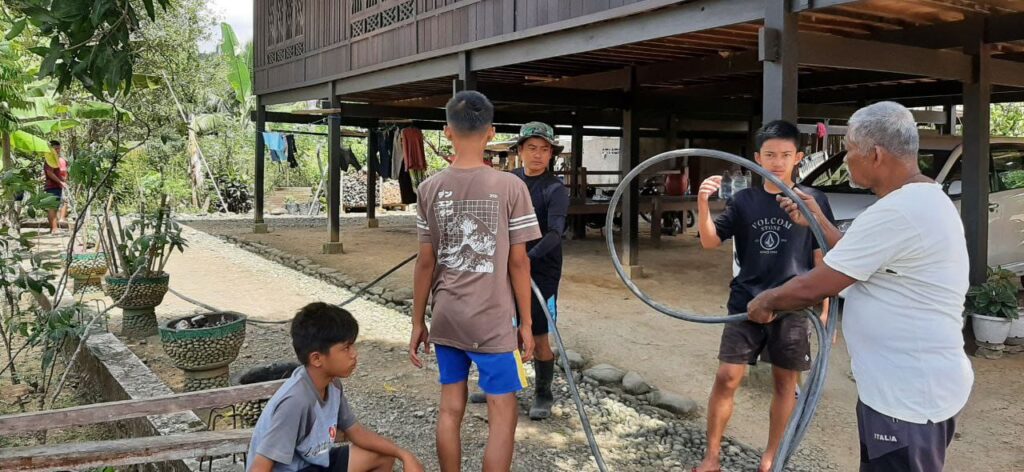 Bati Bakti Siter Kodim 1420/Sidrap, Sertu Darwis Tenreng, mengambil inisiatif untuk membantu warga memasang pipa yang digunakan untuk mengambil air dari sungai.