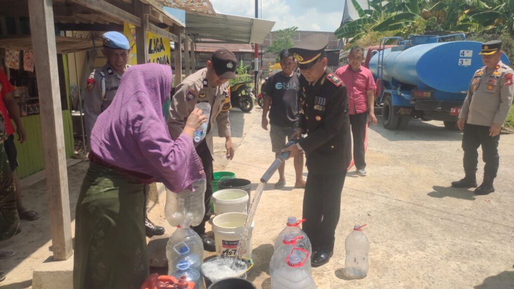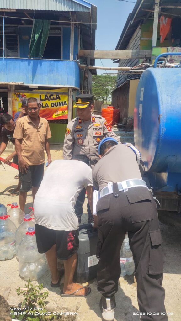 Waka Polres Wajo Kompol Harjoko turun langsung membagikan air bersih di pesisir Danau Tempe, jalan Murni Tae Kelurahan Mattirotappareng Kecamatan Tempe Kabupaten Wajo.