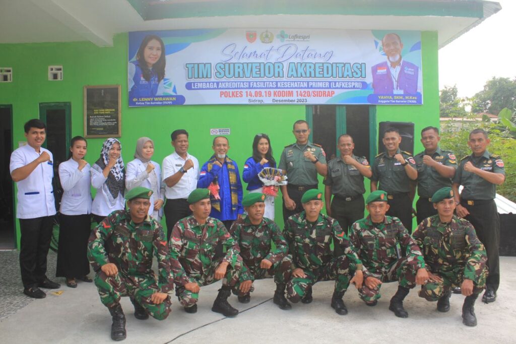 SIDRAP Sulsel Okeindonesia.com- Poliklinik Kesehatan 14.09.19 Kodim 1420/Sidrap menerima kunjungan tim surveior akreditasi Lembaga Akreditasi Fasilitas Kesehatan Primer (Lafkespri) di Jalan Jenderal Sudirman Kelurahan Majelling Wattang Kecamatan Marittengae Kabupaten Sidrap, Kamis (28/12/23).