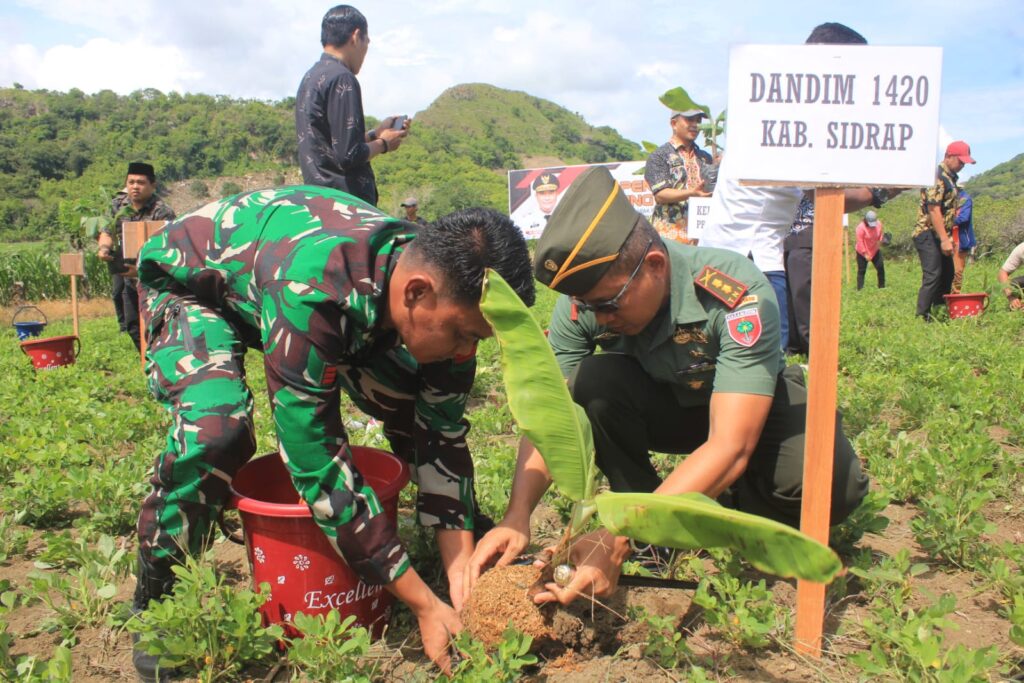 Dandim Andika terlihat di beberapa titik selama kunjungan tersebut, termasuk saat Pj Gubernur melakukan kegiatan penanaman pisang Cavendish di Desa Buae dan peninjauan gelar pangan murah.
