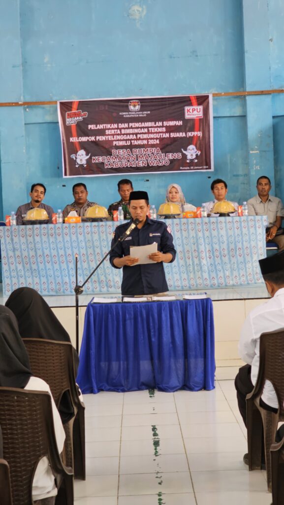 WAJO Sulsel Okendonesia.com- Aipda Syamsuddin Personil Polsek Majauleng Polres Wajo hadiri Pelantikan Pelantikan dan pengambilan sumpah Ketua dan anggota KPPS Desa Rumpia pada pemilu 2024 di gedung serbaguna Desa Rumpia Kec.Majauleng. Kamis ( 25/06/2023).