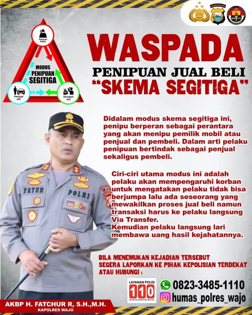 Menurut Kapolres Wajo pada kesempatan tersebut menyampaikan bahwa, didalam modus Penipuan skema Segitiga ini, Penipu akan berperan sebagai perantara yang menipu pemilik mobil atau penjual dan pembeli.