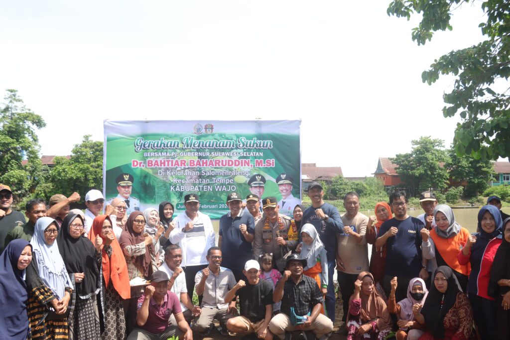 Pada kunjungannya, Pj.Gubernur Sulsel Dr. Bahtiar Baharuddin M.Si melakukan penyerahan dan penaburan benih ikan di danau Tempe dilanjutkan dengan penanaman bibit sukun di TPI Jl. 45 Kel. Salomenraleng Kec. Tempe. Jumat (9/2/2024)
