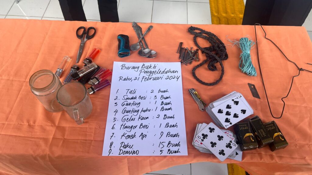 Barang-barang tersebut antara lain, 2 buah tali, 3 buah sendok, 1 buah gunting, 1 buah gunting kuku, 2 buah gelas kaca, 1 buah hanger besi, 9 buah korek api, 15 buah paku, 5 buah Domino,.Nihil Narkoba dan Handphone