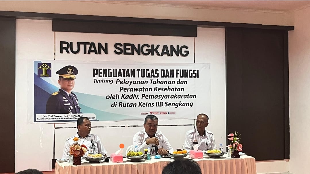 WAJO Sulsel Okeindonesia.com- Rumah Tahanan Negara (Rutan) Kelas IIB Sengkang menerima kunjungan kerja Kepala Bidang (Kabid) Pelayanan Tahanan, Kesehatan, Rehabilitasi, Pengelolaan Basan Barang dan Keamanan Kantor Wilayah (Kanwil) Kementerian Hukum dan HAM (Kemenkumham) Sulawesi Selatan, Rabu (21/2/2024)