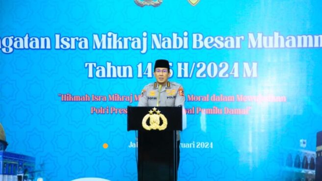 “Perjalanan ilahiyah Nabi Besar Muhammad SAW, peristiwa yang hanya berlaku satu kali dalam sejarah umat manusia, lambang kebesaran dan kehormatan, serta merupakan mukjizat bagi Rasulullah SAW,” ungkap Irwasum mewakili Jenderal Sigit, Selasa (27/2/24).