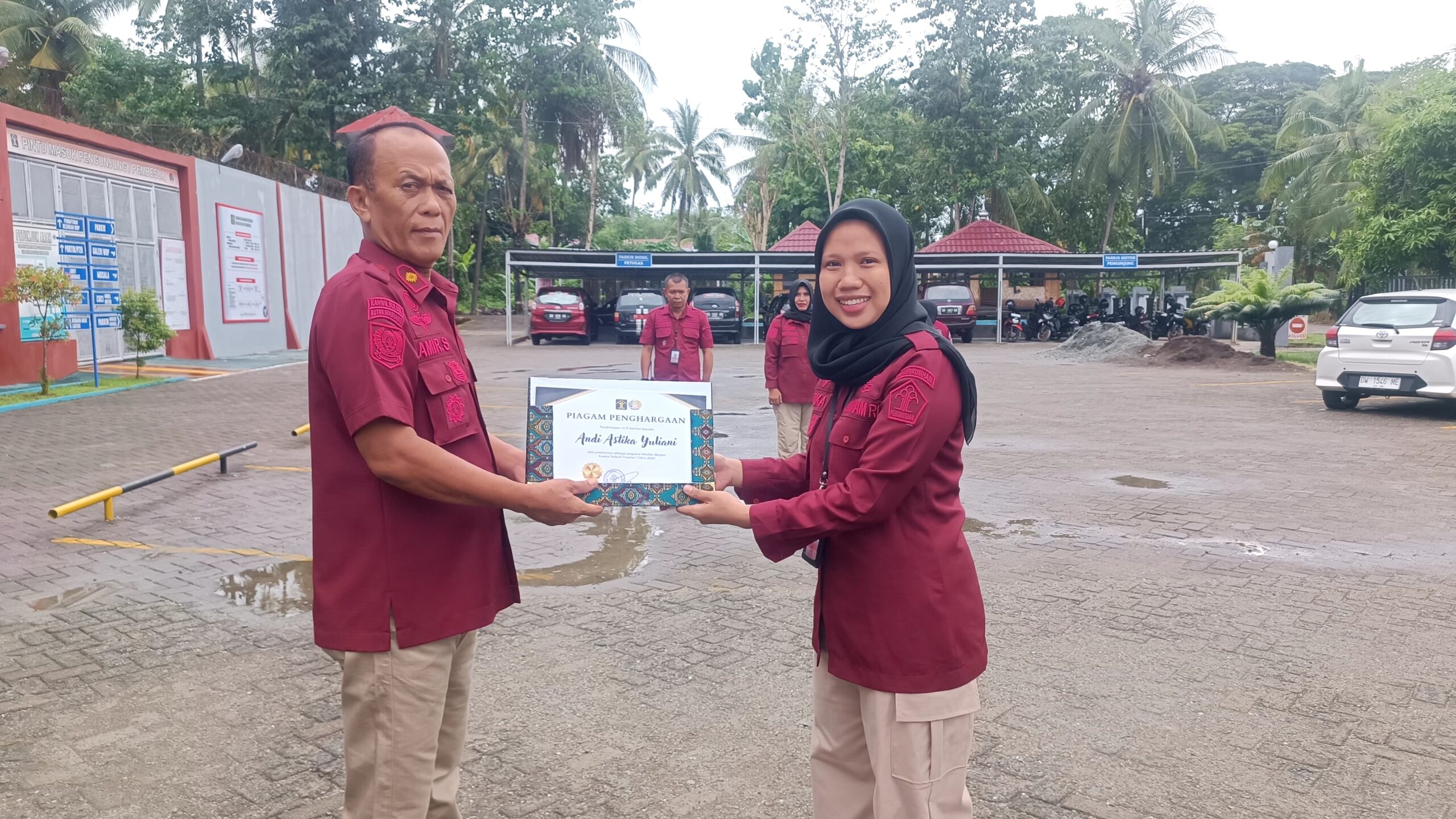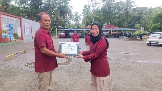Penyerahan Penghargaan Pegawai Teladan diserahkan langsung oleh KA Rutan Sengkang, Amir .S. S.H., Pelaksanaan kegiatan apel pagi pegawai di Halaman Parkir Rutan kelas IIB Sengkang , Kamis, 29/2/2024.