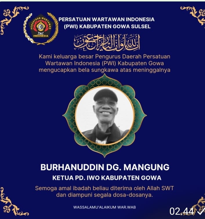 MAKASSAR Okeindonesia.com- Inna Lillahi Wa Inna Ilaihi Roji’un telah berpulang ke Rahmatullah Drs. Burhanuddin Nas. Daeng. Mangung, Ketua PD Ikatan Wartawan Online (IWO ) Kabupaten Gowa, almarhum menghembuskan napas terakhir, karena sakit stroke, di RS. Pelamonia Makassar, Senin sore, 15 April 2024.