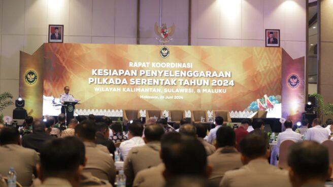 Makassar Okeindonesia.com- Pj. Bupati Wajo Drs. Andi Bataralifu, M.Si menghadiri Rapat Koordinasi Kesiapan Penyelenggaraan Pilkada Serentak Tahun 2024 Wilayah Sulawesi, Kalimantan dan Maluku. Rakor ini diselenggarakan di Ballroom Phinisi, Hotel Claro Makassar, Sulawesi Selatan, Rabu, 26 Juni 2024.