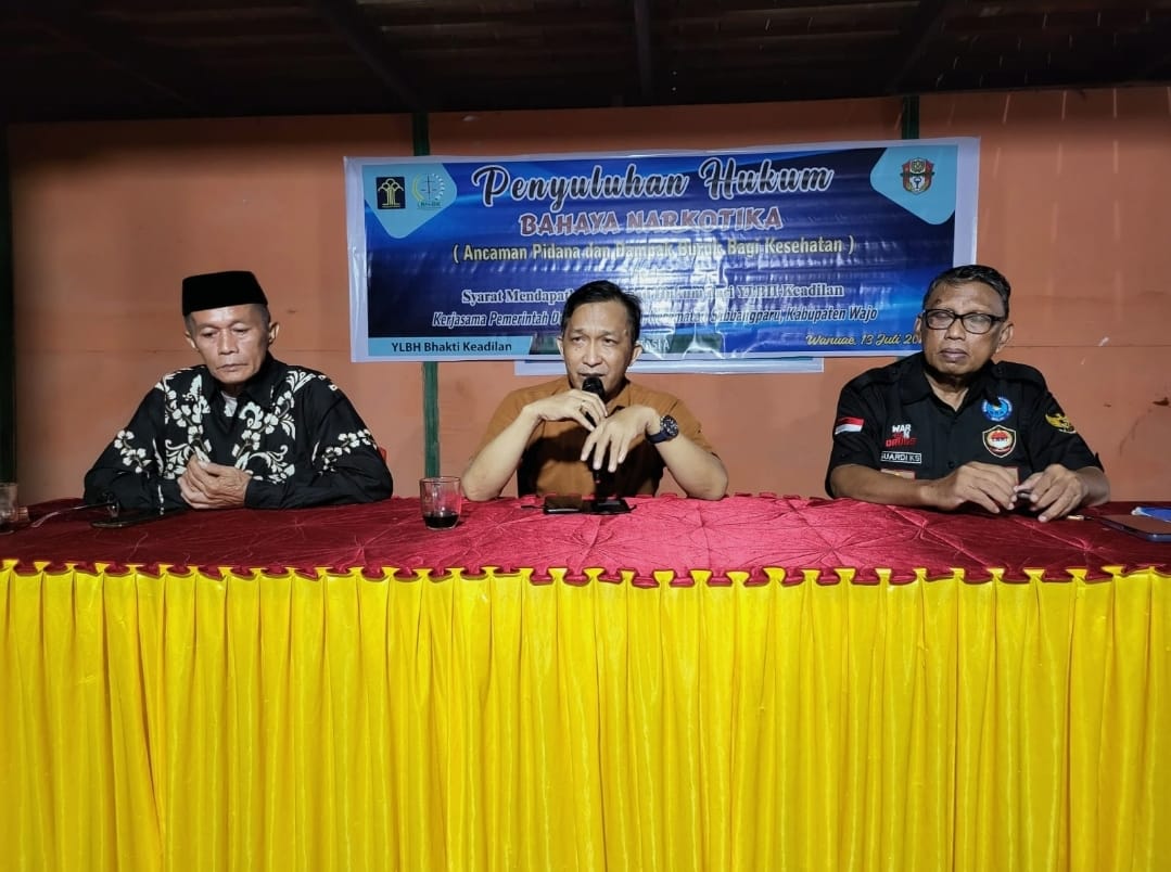 Kegiatan penyuluhan hukum tentang bahaya narkoba dibawakan oleh ketua lembaga LBH Bhakti keadilan Kabupaten Wajo, Muhammad Bakri S.H., beserta dari lembaga BNNK Kabupaten Wajo Kompol (purn), Suardi Kalaseng , di mana menurut beliau kegiatan penyuluhan hukum tentang bahaya narkoba bagi remaja dan masyarakat ini harus dilaksanakan terus-menerus karena hal ini merupakan suatu bentuk manifestasi konkret kepedulian intelektual.