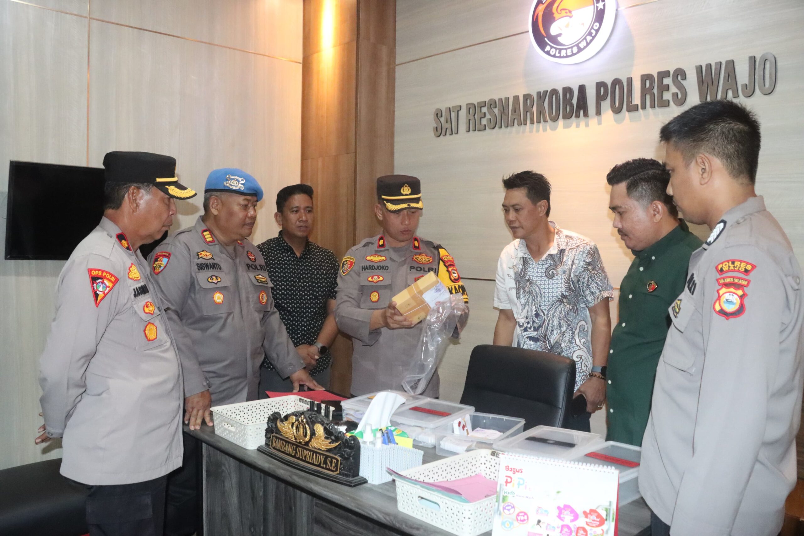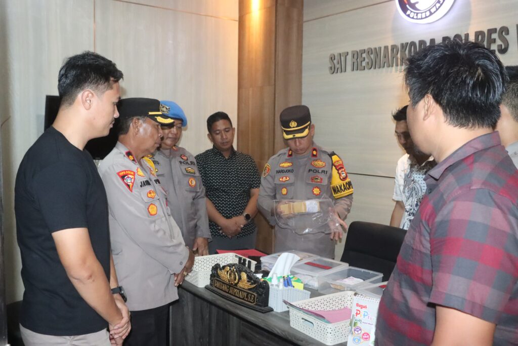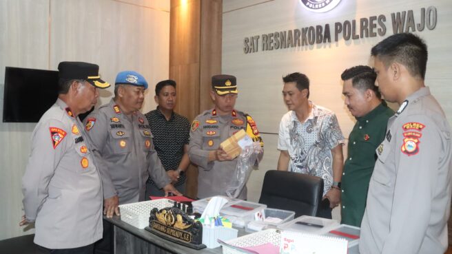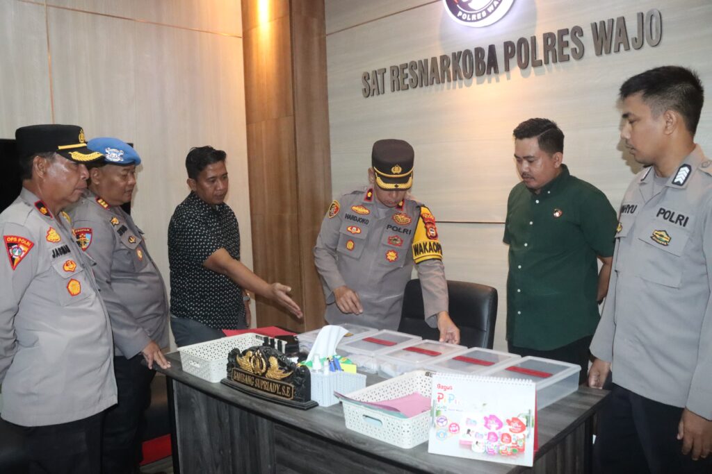 Wajo Sulsel Okeindonesia.online- Wakil Kepala Kepolisian Resor (Polres) Wajo Kompol Hardjoko didampingi Kabag Ops Polres Wajo Kompol Jasmani Parudik, Kasat Narkoba AKP Bambang Supriadi, Kasi Propam Polres Wajo AKP H. Siswanto, KBO Sat Res Narkoba Iptu Fadli bersama Kanit 1 Ipda Andi Pabbentengi Arman dan anggota Siwas Polres Wajo Bripka Mahyudin. Jum’at (16/8/2024) melakukan pengecekan barang bukti hasil tangkapan Sat Res Narkoba Polres Wajo.