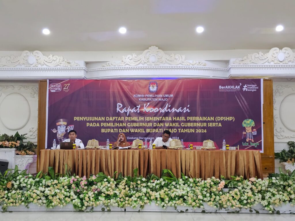 Wajo Sulsel Okeindonesia.online- Bertempat di gedung Darmawan jalan Andi Paggaru sengkang, Kamis 22 Agustus 2024, KPU Kabupaten Wajo melaksanakan rapat koordinasi penyusunan daftar pemilih sementara hasil perbaikan (DPSHP) Pada Pemilihan Gubernur dan Wakil Gubernur Serta Bupati dan Wakil Bupati Wajo Tahun 2024.