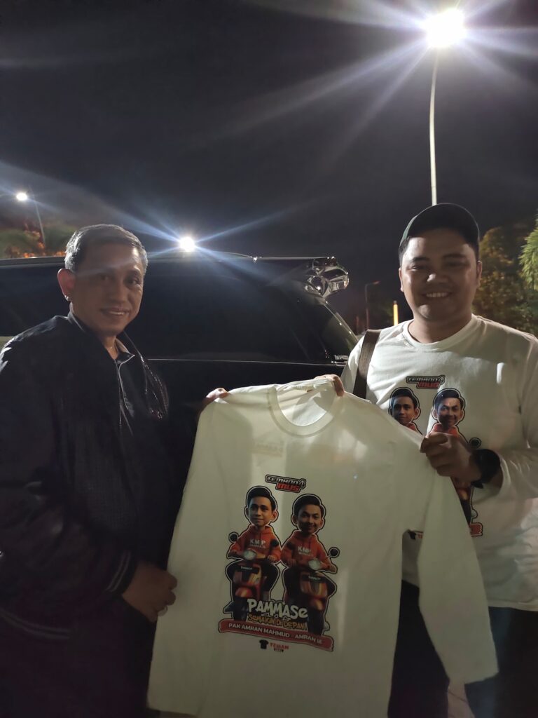 “Hari ini kami bersilaturahmi dengan pak Amran Mahmud sekaligus menyerahkan kaos dari usaha yg sementara kami rintis. Hal itu sebagai bentuk dukungan bahwa kami siap All Out memenangkan beliau,” tutur Mus.