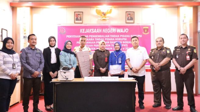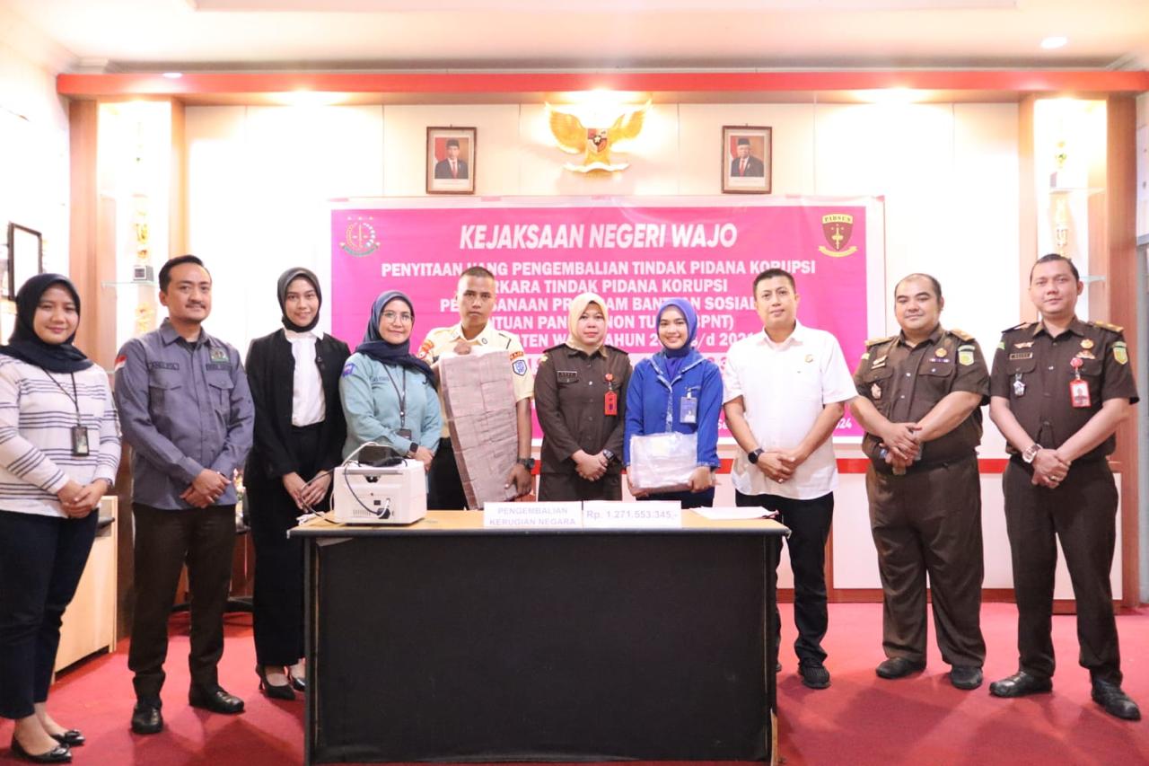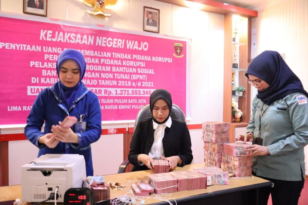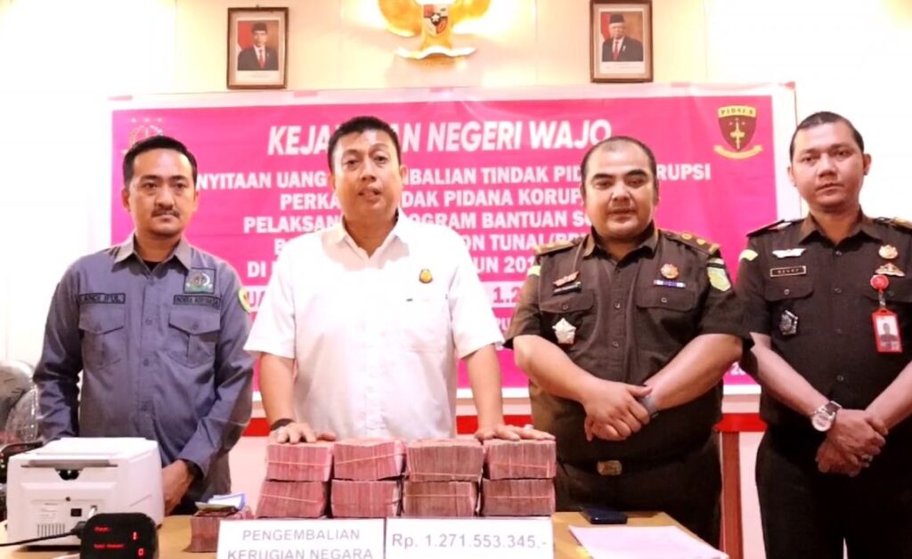 Kepala Kejaksaan Negeri Wajo Andi Usama Harun. S.H., M.H., bersama dengan tim penyidik menerima pengembalian kerugian negara kerugian keuangan tersebut langsung dari tersangka AN beserta keluarganya sebesar Rp.1.271.553.345.,- (satu miliar dua ratus tujuh puluh satu juta lima ratus lima puluh tiga tiga ratus empat puluh lima rupiah), yang selanjutnya dilakukan penyitaan atas uang tersebut.