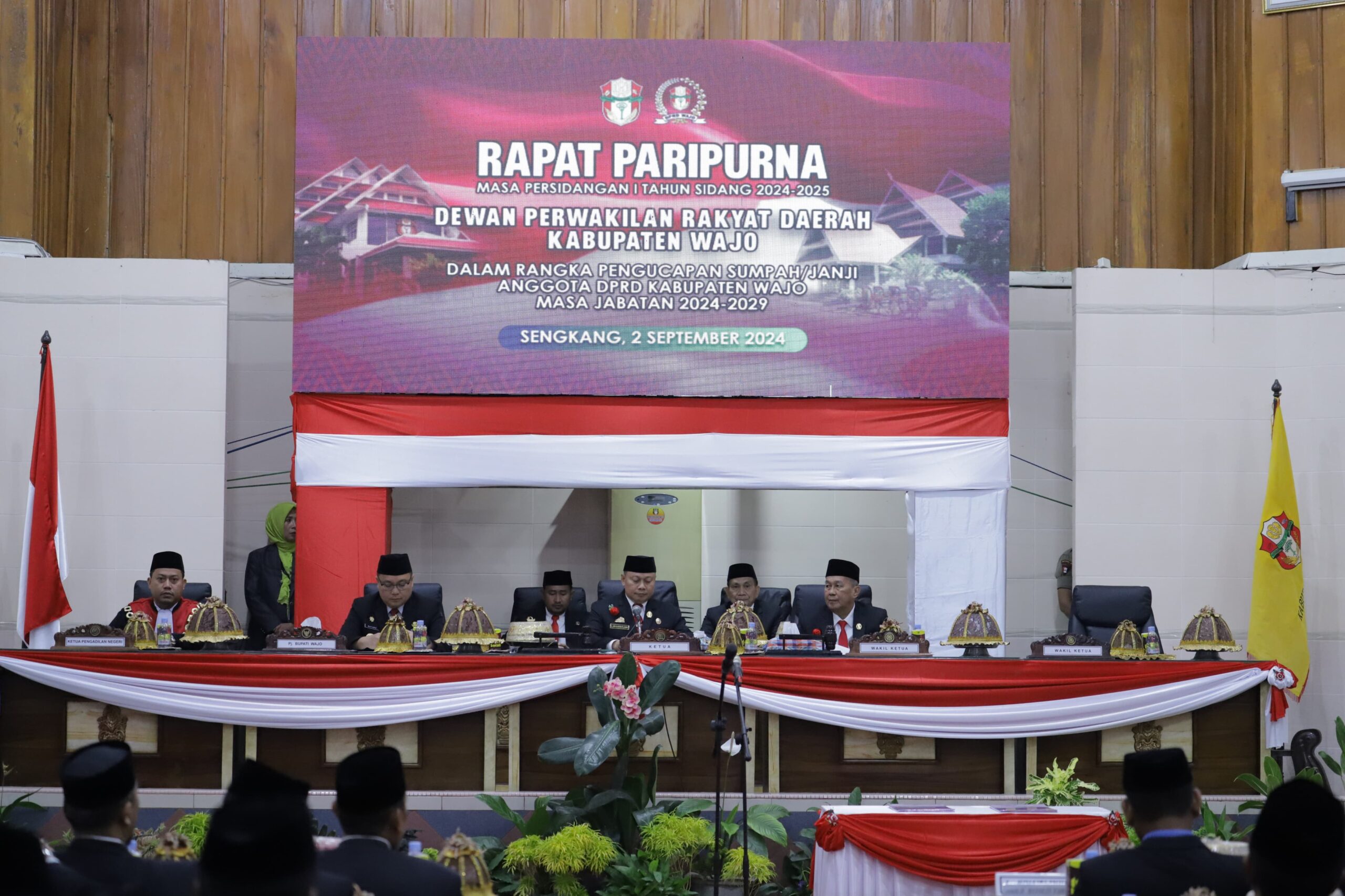 Ketua DPRD Wajo periode 2019-2024, Andi Alauddin Palaguna, secara simbolis menyerahkan tongkat estafet kepemimpinan kepada pimpinan sementara, Firmansyah Perkesi dan Andi Merly Iswita, yang akan mengemban tugas hingga terbentuknya pimpinan definitif.
