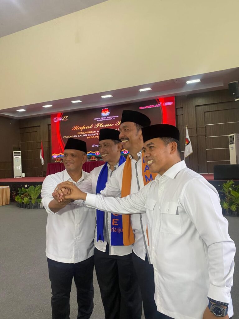 Wajo Sulsel Okeindonesia.online- Pada Hari Senin ,23 September 2024 Pukul 10.00 Wita bertempat di depan gedung ruang pola Kantor Bupati Wajo telah di gelar rapat pleno terbuka pengundian dan penetapan nomor urut pasangan calon Bupati dan Wakil Bupati Kab.Wajo 2024.