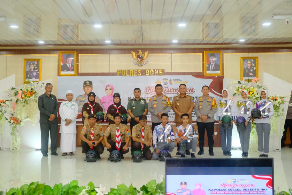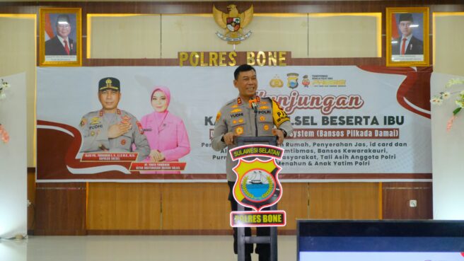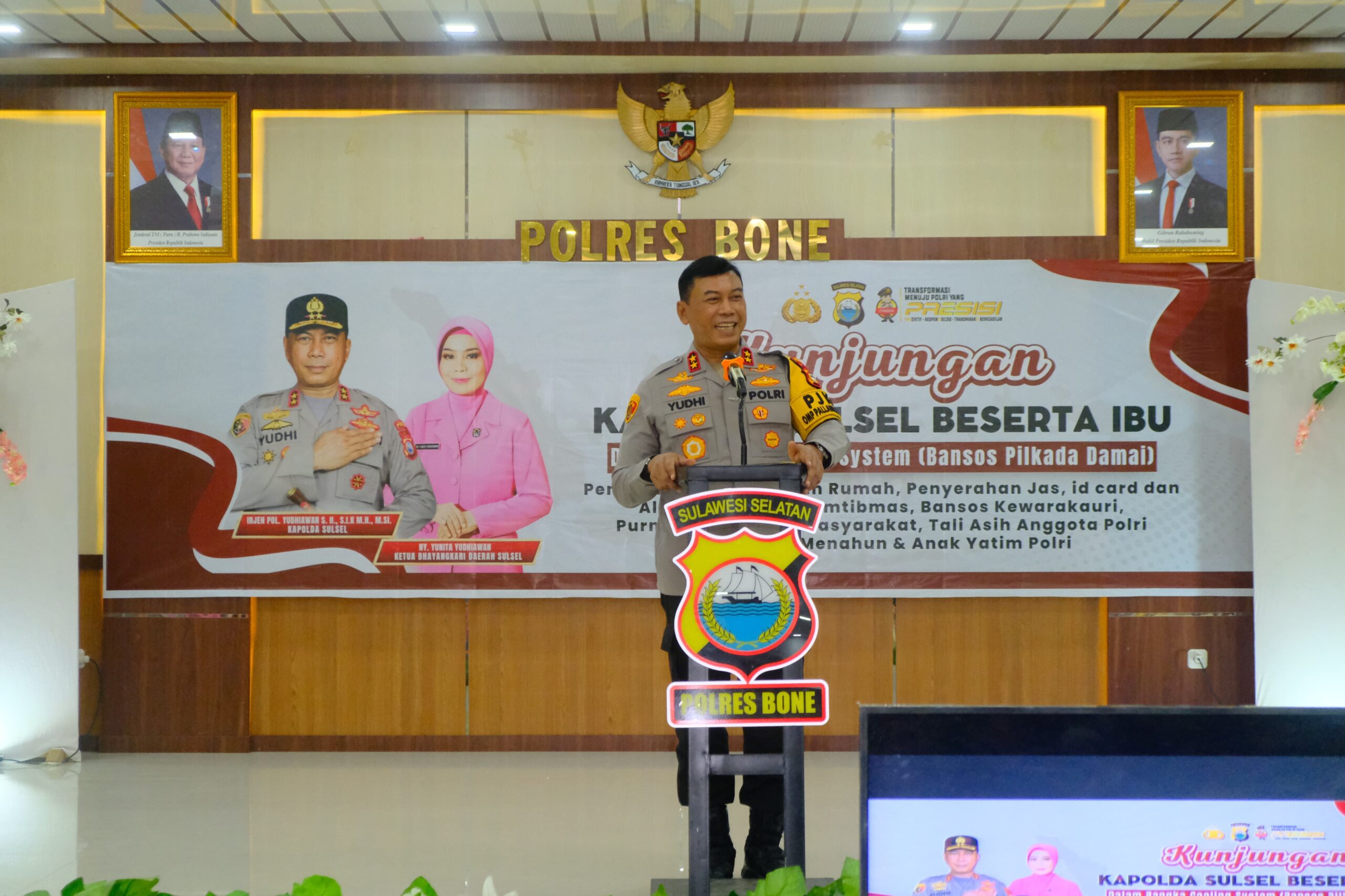 Bone Sulsel Okeindonesia.online- Kapolda Sulawesi Selatan, Irjen Pol. Yudhiawan S.H., S.I.K., M.H., M.Si., melaksanakan kunjungan kerja di Polres Bone dalam rangka program Cooling System Bansos Pilkada Damai 2024. , Selasa (29/10/24). Dalam kunjungan tersebut, Kapolda Sulsel didampingi Ketua Bhayangkari Daerah Sulawesi Selatan, Ny. Yunita Yudhiawan, dan Ustad Das’ad Latif.