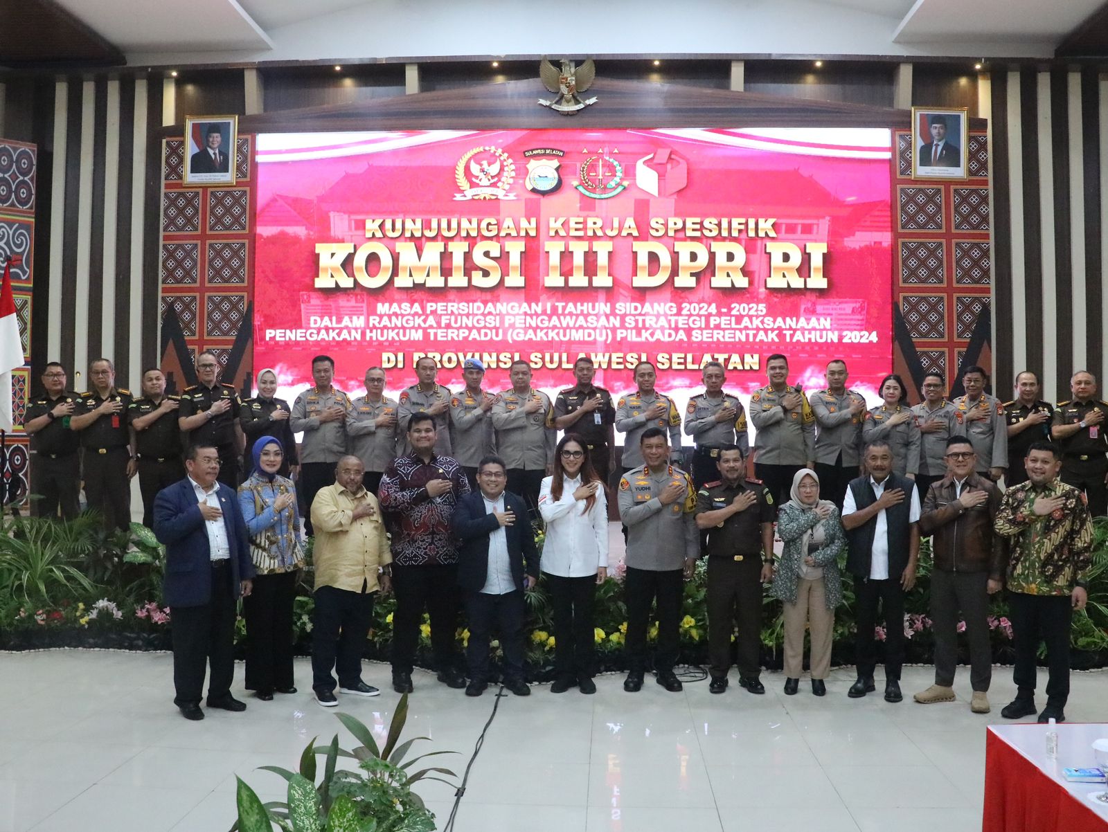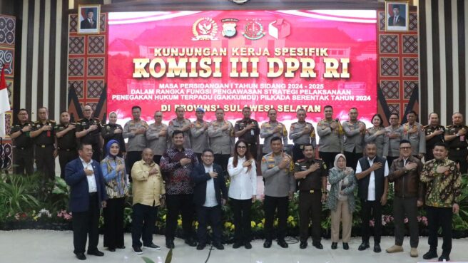Makassar Sulsel Okeindonesia.online- Komisi III DPR RI melakukan kunjungan kerja spesifik ke Provinsi Sulawesi Selatan Masa Persidangan I Tahun Sidang 2024-2025 Dalam Rangka Fungsi Pengawasan Strategi Pelaksanaan Penegakan Hukum Terpadu (Gakkumdu) Pilkada Serentak Tahun 2024. Kegiatan ini berlangsung di Aula Mappaodang Mapolda Sulsel, Kamis (31/10/24).