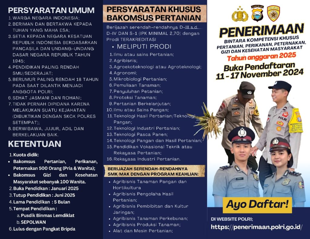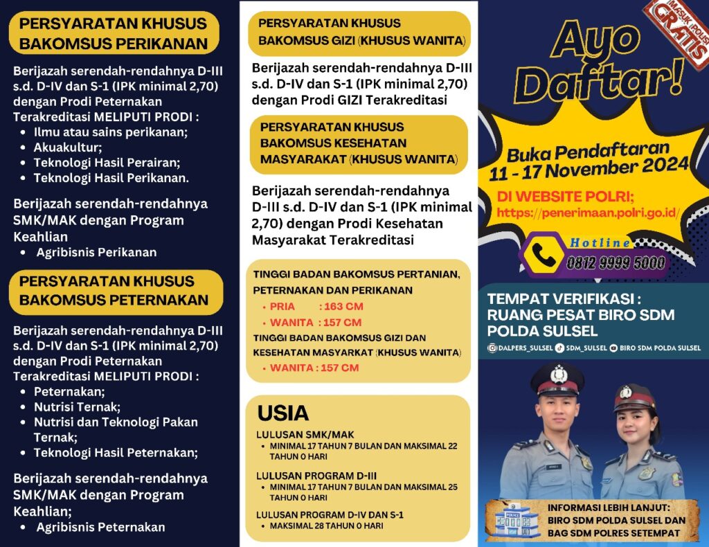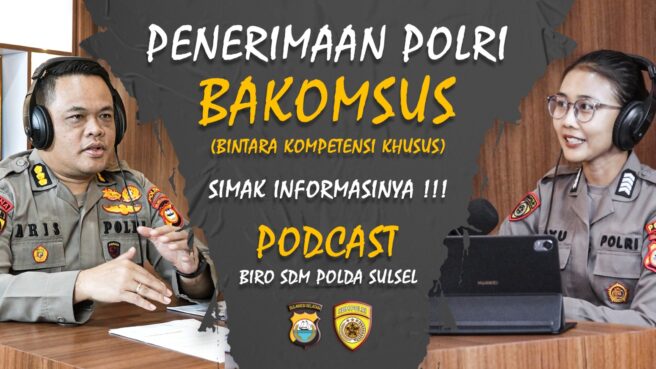 Bintara Bakomsus 2025 dibuka untuk bidang pertanian, perikanan, peternakan, gizi, dan kesehatan masyarakat. Bakomsus 2025 akan dididik selama lima bulan pada Februari-Juli 2025, ” ucap Karo SDM Polda Sulsel Kombes Pol Aris Haryanto, SIK, M.Hum saat menjadi narasumber pada Podcast Biro SDM Polda Sulsel, Jumat (2/11/2024).