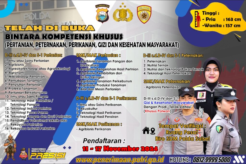 Makassar Sulsel Okeindonesia.online- Kepolisian Negara Republik Indonesia (Polri) melalui Biro SDM Polda Sulsel membuka Penerimaan Bintara Kompetensi Khusus (Bakomsus) 2025. Lulusan SMK/sederajat/D-III,DIV,S.1.