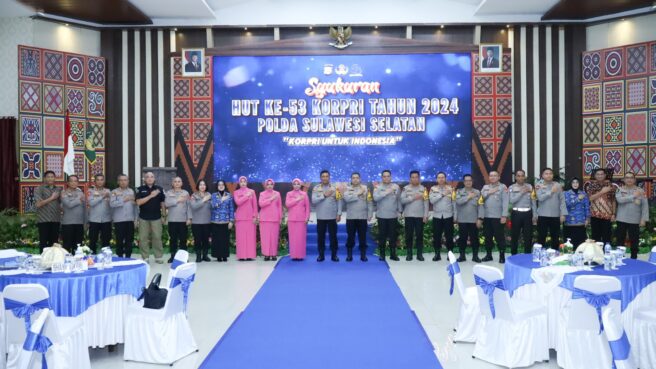 Syukuran HUT KORPRI yang diperingati ASN Polda Sulsel, ditandai pemotongan tumpang oleh Kapolda Sulsel dan pemberian penghargaan kepada ASN Polda Sulsel yang berprestasi serta penyerahan Tali Asih ke Pensiunan PNS Polri.