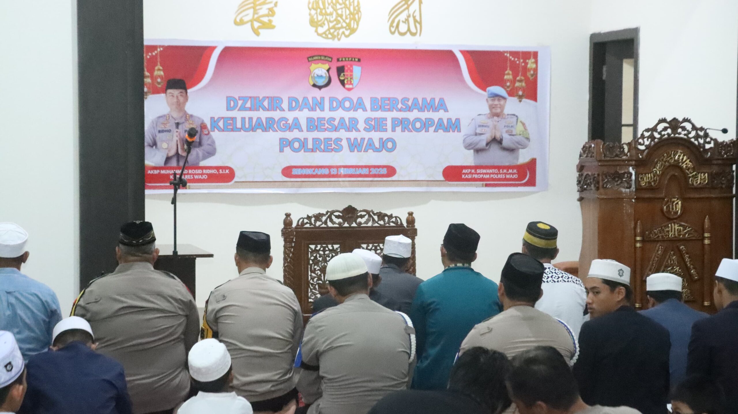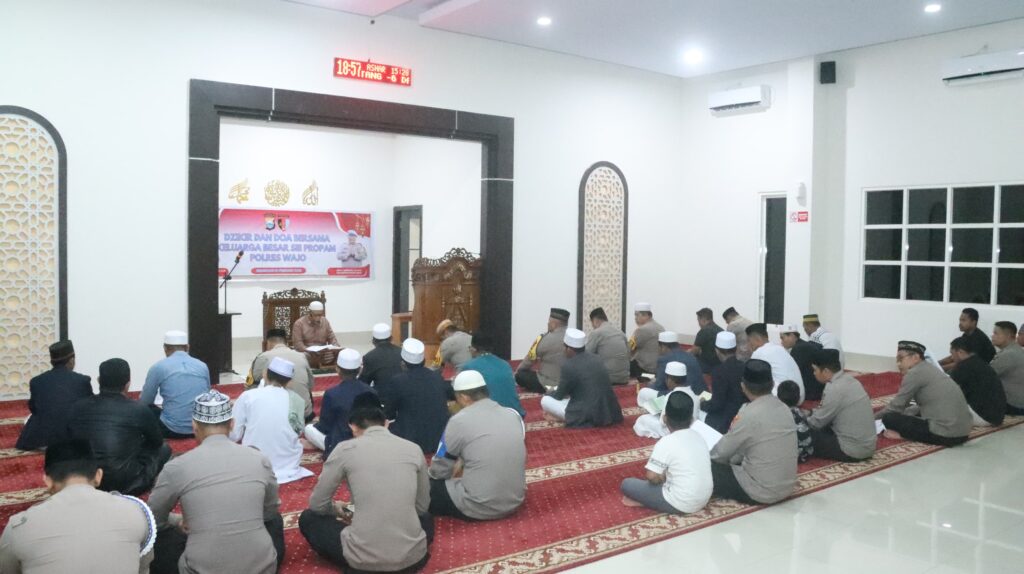 Wajo Sulsel Okeindonesia.online- Kepolisian Resor Wajo dan Polsek jajaran menggelar dzikir dan doa bersama menyambut malam Nisfu Sya’ban di Masjid At-Taqwa Mapolres Wajo. Kamis 12 Februari 2025, sekitar pukul 18.40 Wita.