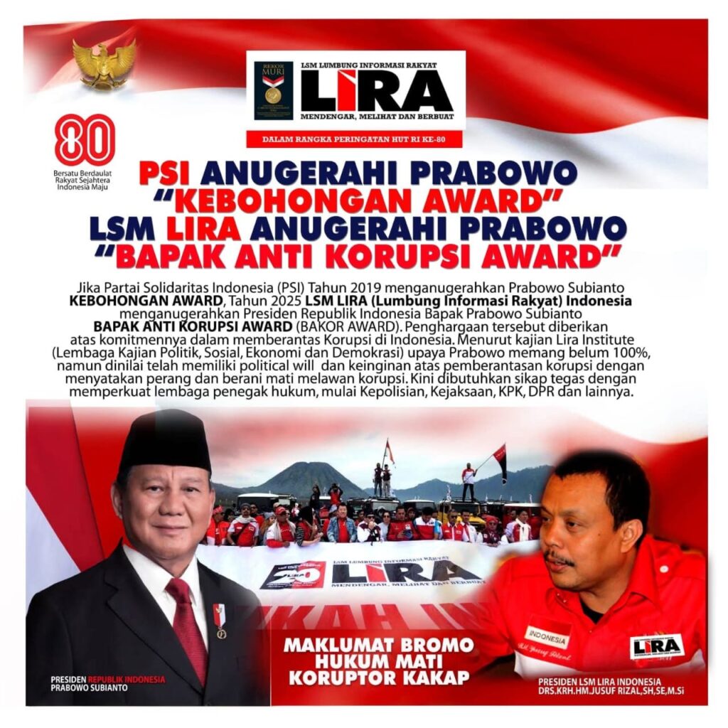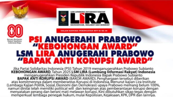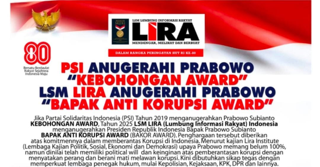 Jakarta Okeindonesia.online- Jika PSI (Partai Solidaritas Indonesia) tahun 2019 memberikan Kebohongan Award kepada Prabowo Subianto, tahun 2025 LSM LIRA (Lumbung Informasi Rakyat) memberikan Bapak Anti Korupsi Award (BAKOR AWARD) kepada Prabowo Subianto