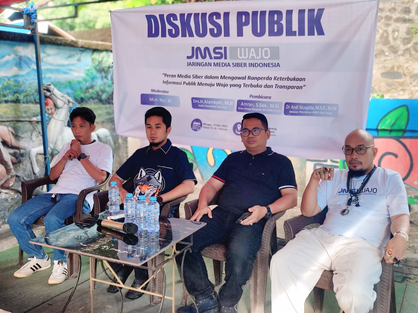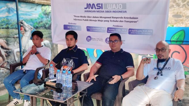 Diskusi dipandu moderator Muhammad Nur, SE, dengan menghadirkan narasumber diantaranya, Ketua Pansus Ranperda KIP DPRD Wajo Amran, S.Sos., M.Si., Kepala Dinas Pendidikan Wajo Drs. H. Alamsyah, M.Si., serta Dewan Pembina JMSI Wajo Dr. Andi Muspida, M.SP., M.Pd.