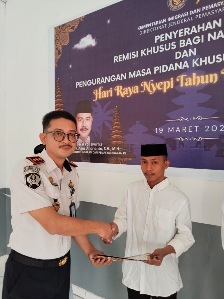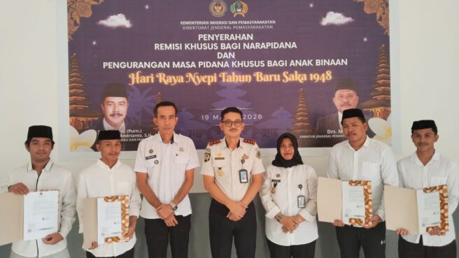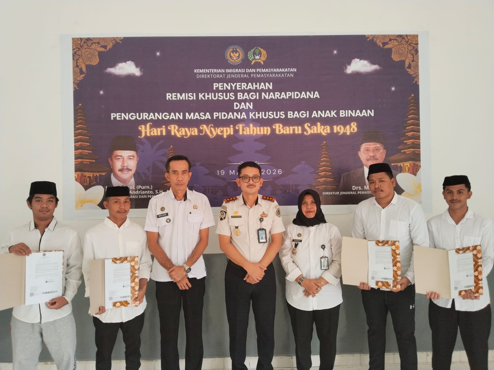 Wajo Sulsel Okeindonesia.online- Rumah Tahanan Negara (Rutan) Kelas IIB Sengkang menyerahkan Remisi Khusus Hari Raya Nyepi Tahun 2026 kepada 5 orang warga binaan yang beragama Hindu, Kamis (19/3/2026).